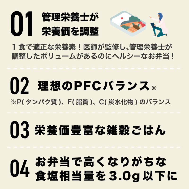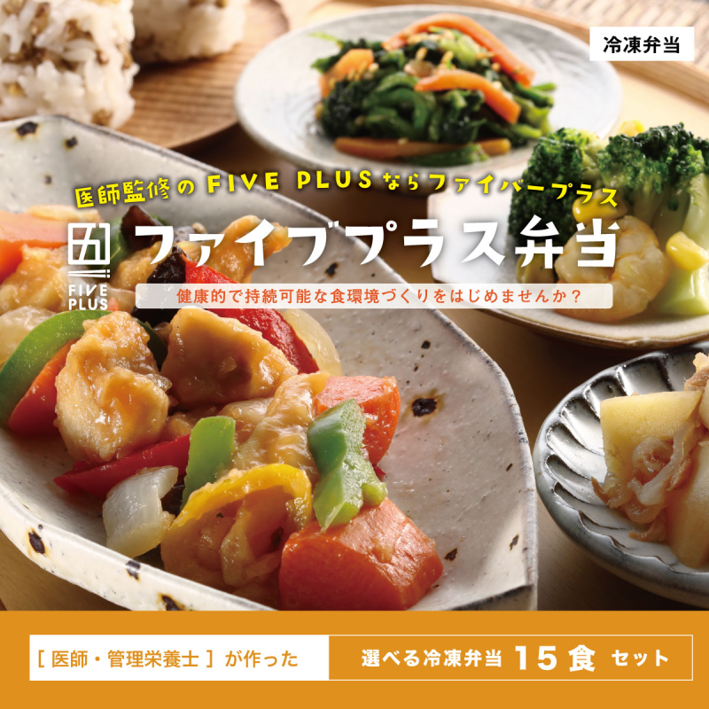 現役臨床医監修のファイブプラス冷凍弁当。 食物繊維にこだわり、お弁当ひとつでレタス2個分の食物繊維6.0g以上が取れます。さらにもち麦ご飯など「低GI食品」を使用しています。 また管理栄養士が栄養価を調整し、厚生労働省が策定する「日本人の食事摂取基準2020年版」に準拠!理想のPFCバランスを実現しました。 【ファイブプラス弁当の魅了】 ①医師が監修しているので栄養価が豊富。なのに満足なボリューム! ②理想のPFCバランス!(P=タンパク質・F=糖質・C=炭水化物) ③食物繊維量は6.0g以上、低GI食品のもち麦ごはん付き ④高くなりがちな食塩相当量を3.0g以下に調整! ⑤冷凍だからチンするだけで、いつでも食べられる!