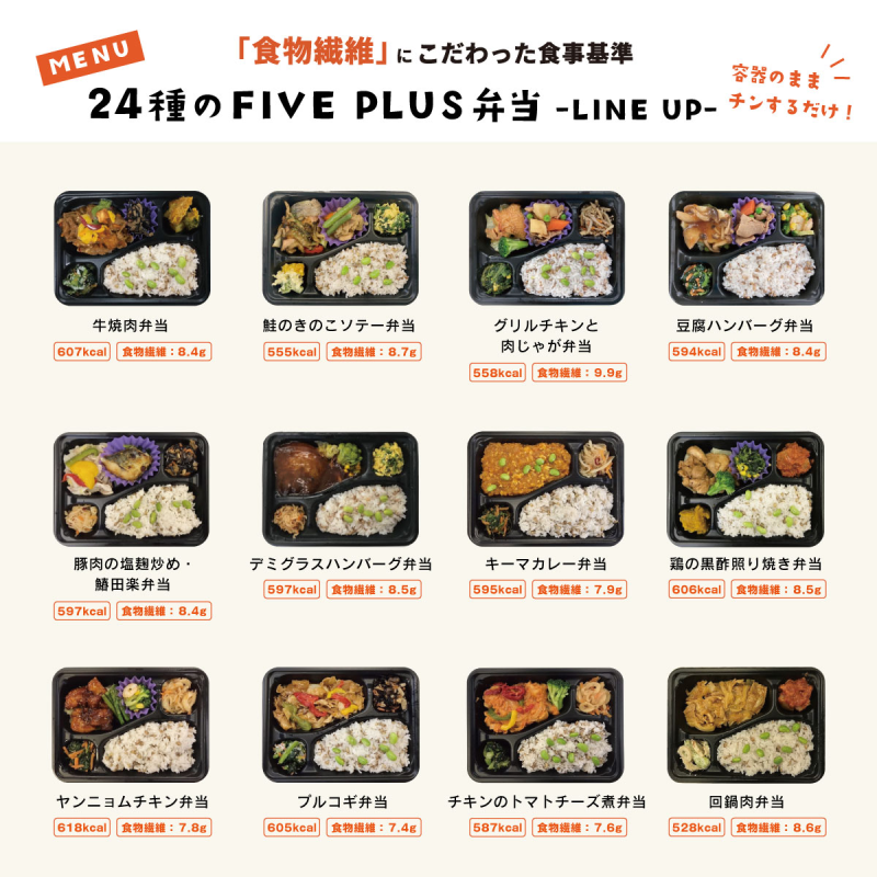 現役臨床医監修のファイブプラス冷凍弁当。 食物繊維にこだわり、お弁当ひとつでレタス2個分の食物繊維6.0g以上が取れます。さらにもち麦ご飯など「低GI食品」を使用しています。 また管理栄養士が栄養価を調整し、厚生労働省が策定する「日本人の食事摂取基準2020年版」に準拠!理想のPFCバランスを実現しました。 【ファイブプラス弁当の魅了】 ①医師が監修しているので栄養価が豊富。なのに満足なボリューム! ②理想のPFCバランス!(P=タンパク質・F=糖質・C=炭水化物) ③食物繊維量は6.0g以上、低GI食品のもち麦ごはん付き ④高くなりがちな食塩相当量を3.0g以下に調整! ⑤冷凍だからチンするだけで、いつでも食べられる!
